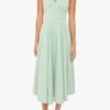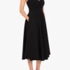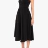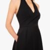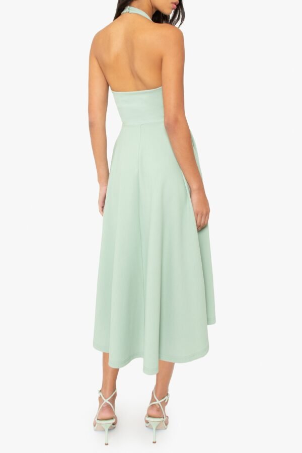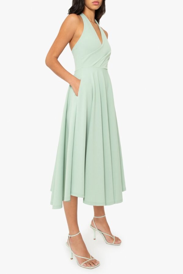 A timeless halter dress with a modern edge. Designed with a wrap V-neck bodice and delicate draping in a stretch knit crepe. it features a self-covered button closure at the back of the neck. The full circle skirt adds movement. while side seam pockets keep it effortlessly functional.