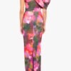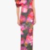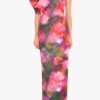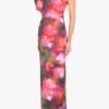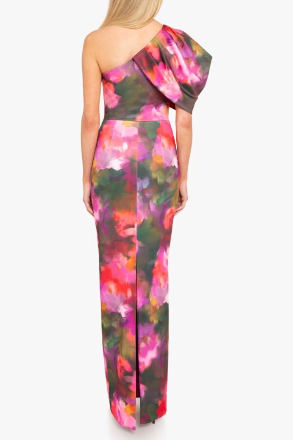 Make a statement in the Egan Gown. made from a printed stretch knit fabric. designed with a striking asymmetrical one-shoulder neckline and a bold puff sleeve. The tailored bodice features sculpted tucks at the waist. creating a contoured fit that flows into a sleek column silhouette. Finished with a hidden back zipper and fully lined for a smooth finish.