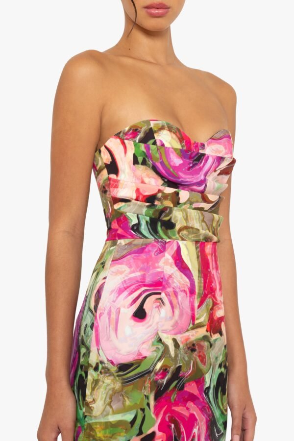 A striking strapless column gown featuring an abstract rose print that makes a bold statement. The structured bodice is designed with a cup detail and a draped overlay. creating a flattering silhouette.
